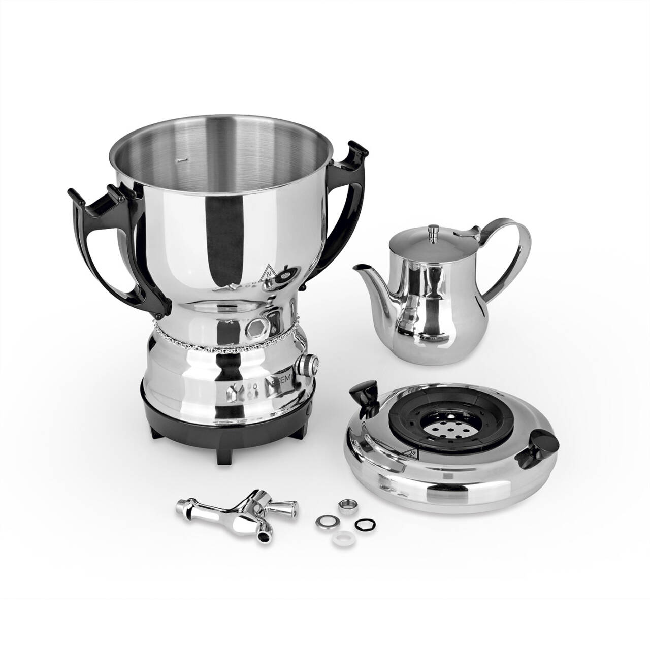Der klassische Wasserkocher bzw. Heißwasserbereiter wird zur Zubereitung von Heißgetränken wie Tee verwendet. Dabei funktioniert der Samowar elektrisch und hat ein Fassungsvermögen von 3 Liter und einer 1 Liter Teekanne. Mit dem stufenlosen Temperaturregler kann die Temperatur individuell geregelt werden. Der Tea Classic Teekocher ist ideal für Zuhause, auch für den Gastronomiebereich geeignet und aus einem hochwertigen Edelstahlgehäuse.