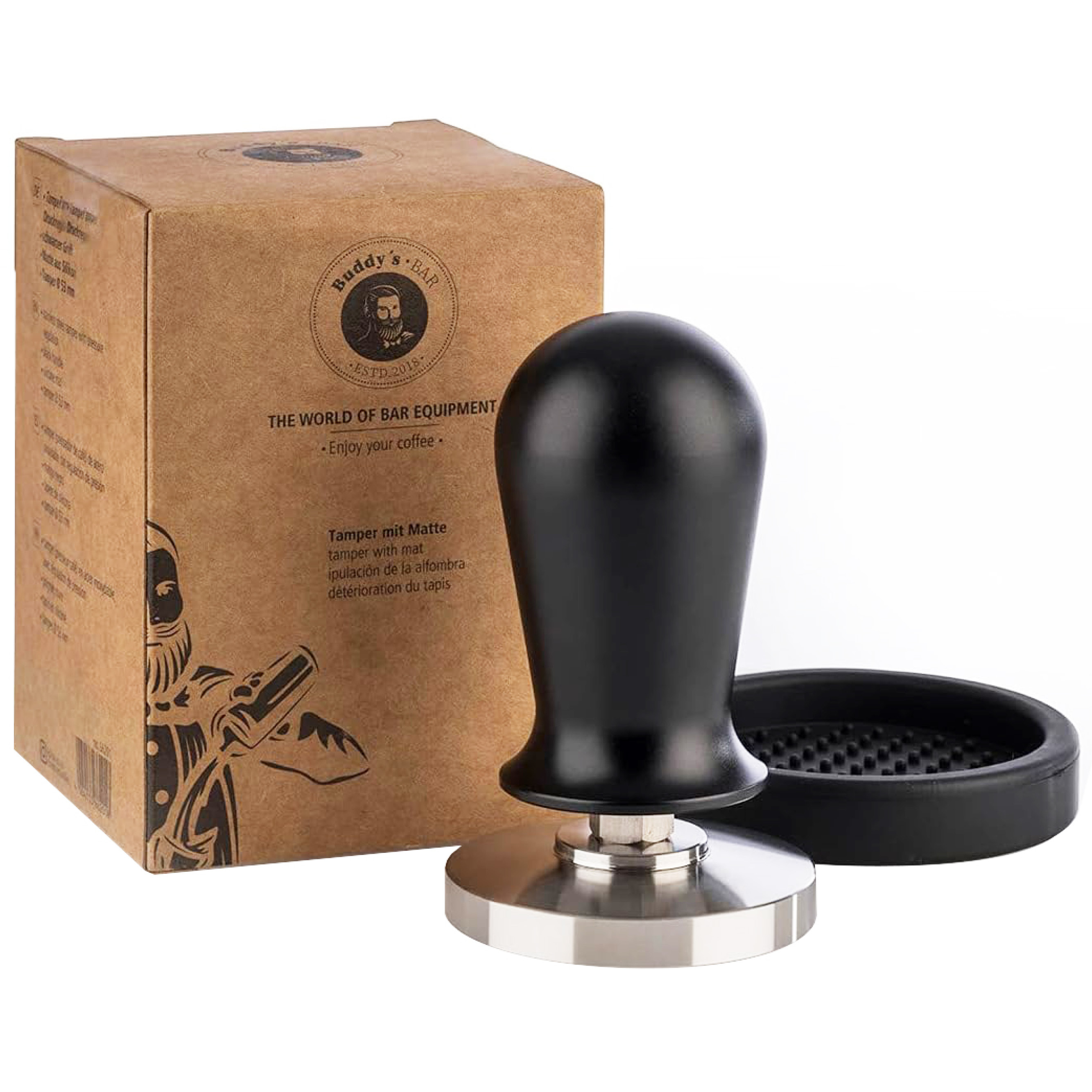 Erleben Sie mit dem Buddy’s Barista Tamper aus Edelstahl ein unverzichtbares Werkzeug, das Ihnen die Zubereitung eines perfekten Espressos erleichtert. Genießen Sie den Moment, in dem Sie die frisch gemahlenen Kaffeebohnen gleichmäßig und präzise komprimieren – für ein vollmundiges Aroma und eine samtige Crema, die jeden Kaffee zum Genuss macht. Der elegante Edelstahlkörper kombiniert mit einem ergonomisch geformten schwarzen Griff sorgt nicht nur für eine ansprechende Optik, sondern auch für eine optimale Handhabung.