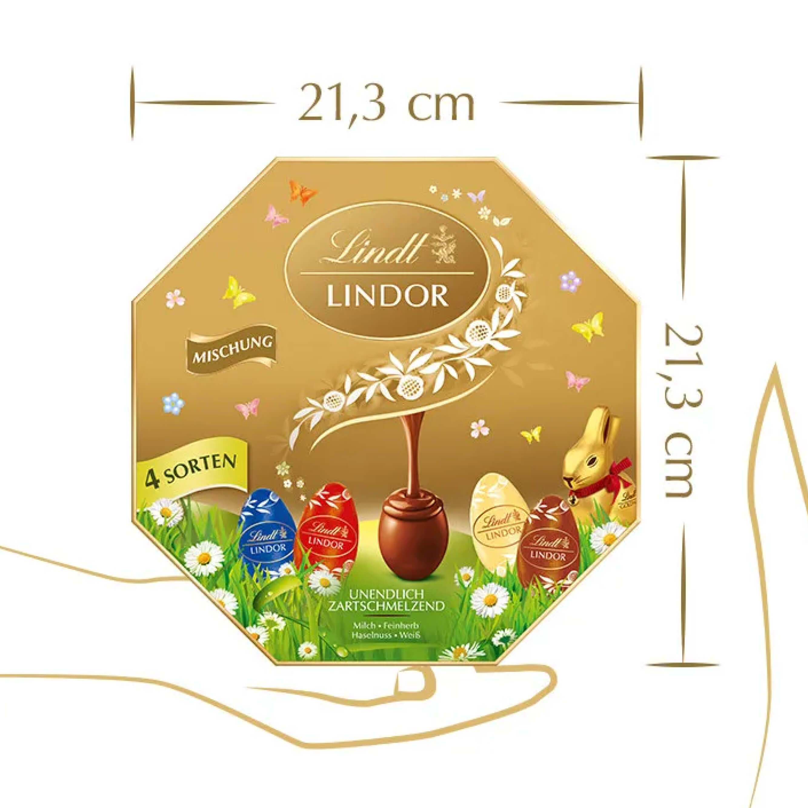 Wenn die feine Schokoladenhülle bricht, entfaltet sich die unvergleichlich zartschmelzende LINDOR Füllung und verwandelt jeden Bissen in pure Schokoladenglückseligkeit. Diese harmonische Mischung aus vier edlen Sorten ist ideal zum Teilen, Verschenken oder Genießen – ein Premium-Ostererlebnis für anspruchsvolle Genießer.
