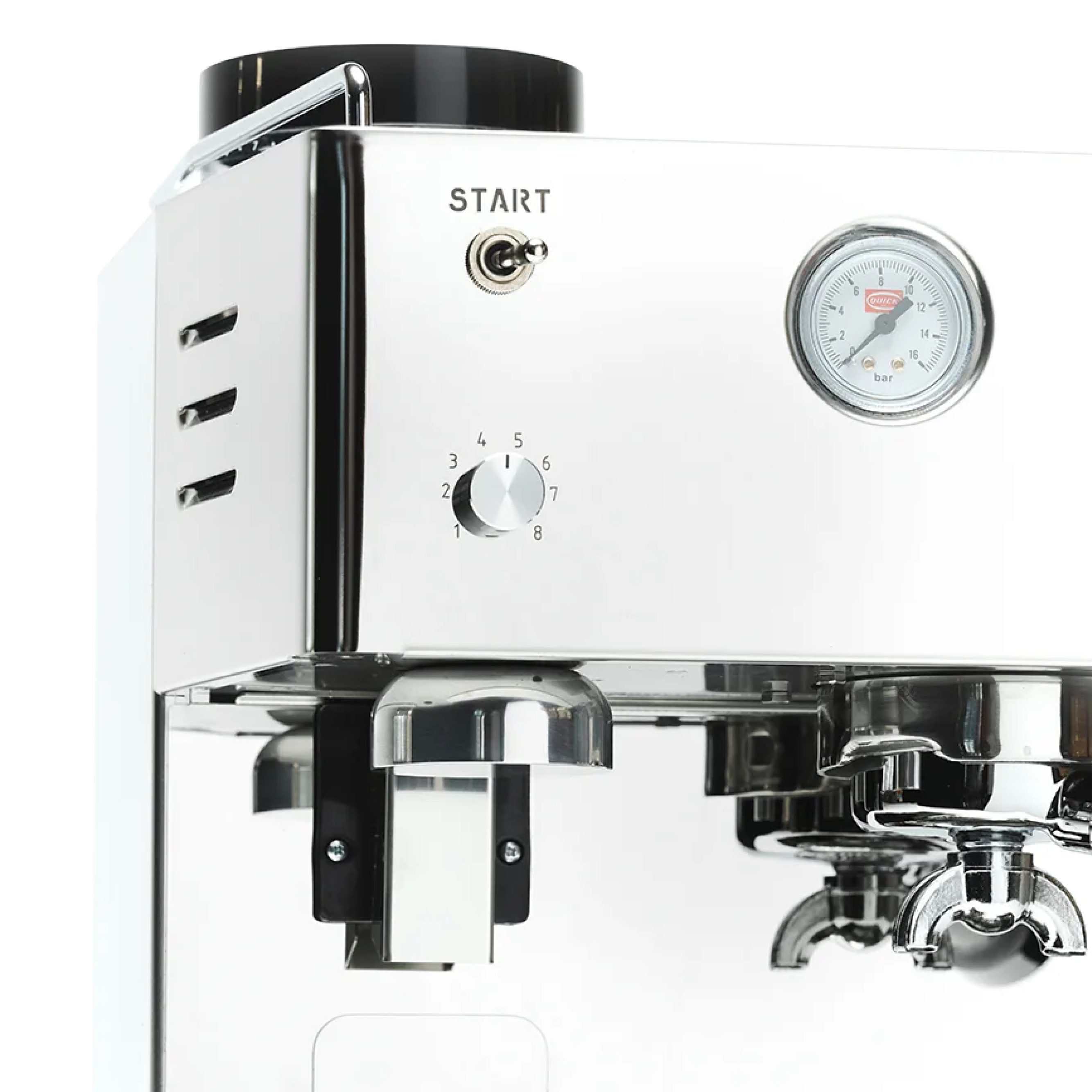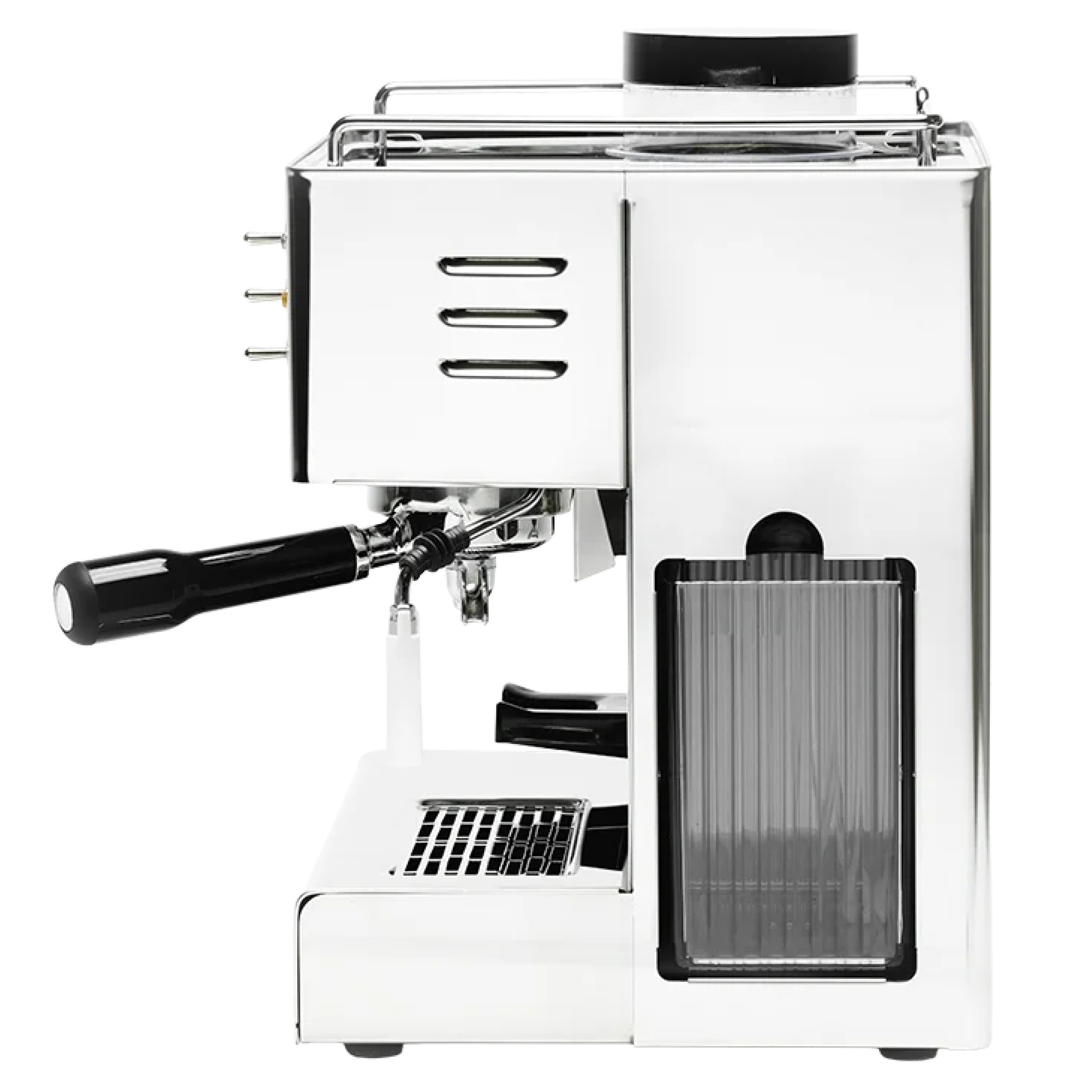 Die Pegaso 3035 vereint Espressomaschine und Kaffeemühle in einem Gerät, ohne Kompromisse bei Leistung oder Design. Der integrierte Thermoblock ermöglicht kurze Aufheizzeiten, während der Pulsor für stabilen Pumpendruck sorgt. Der Mahlgrad und die Mahlzeit lassen sich elektronisch regulieren – ideal für konstante Ergebnisse. Das Edelstahlgehäuse, das Retro‑Design mit Manometer und Kippschaltern sowie die warme Tassenablage verleihen ihr zusätzlich professionellen Charakter.